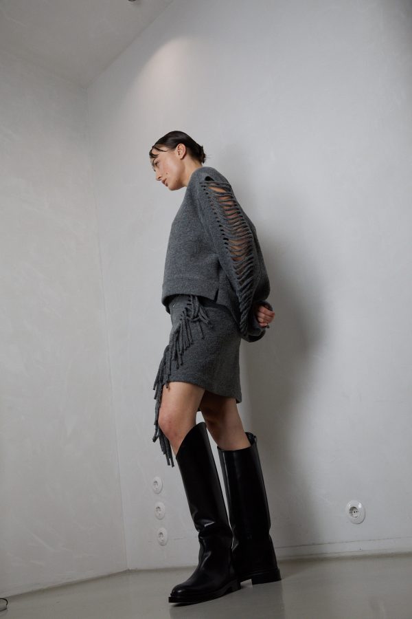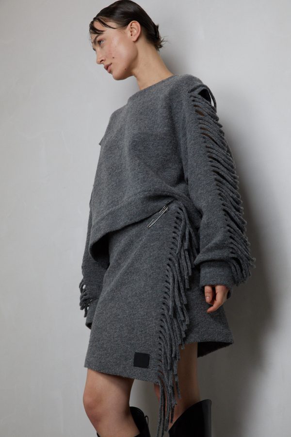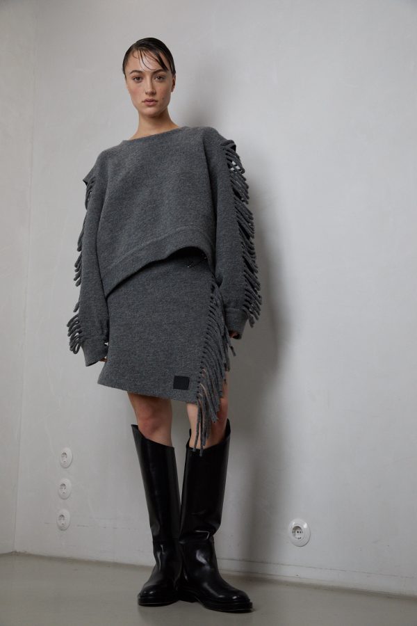 Der Fringed Wool Mini Skirt hat eine Zusammensetzung aus 55% Wolle, 30% Polyester, 15% Polycarbonat.