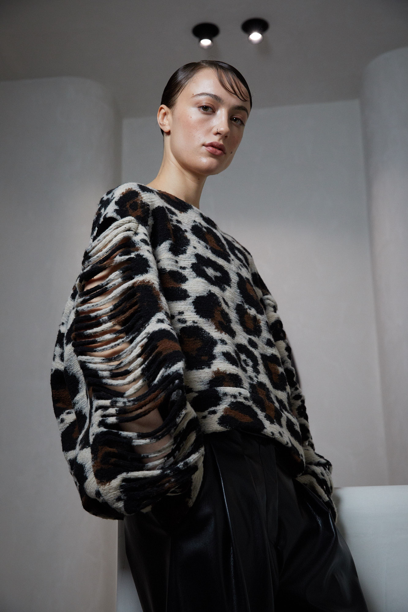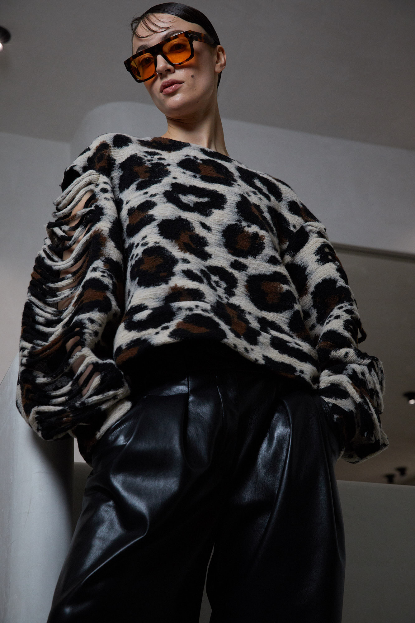Das Model trägt Größe 36 in dem Leo-Muster.