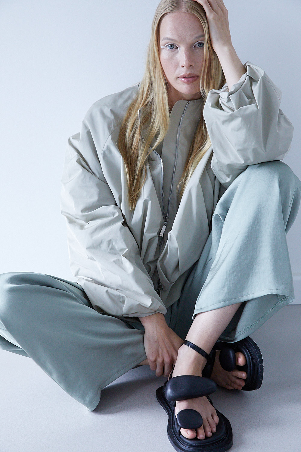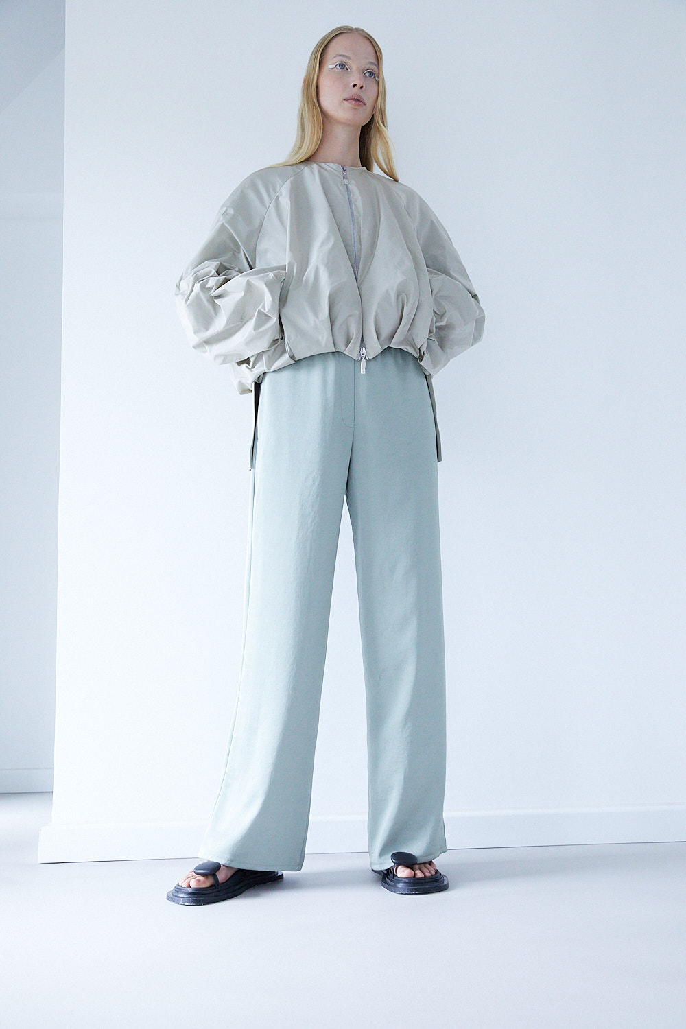 Das Model trägt Größe 36 in der Farbe pistacchio.
